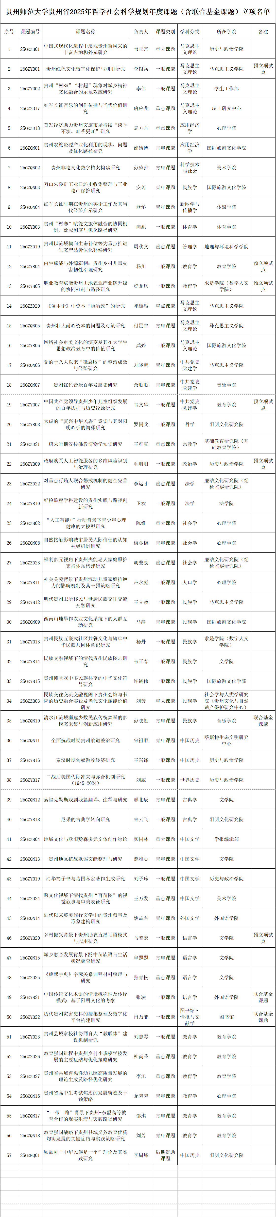 近日,貴州省哲學社會科學規劃辦公室正式公布貴州省2025年哲學社會科學規劃年度課題立項名單,貴州師范大學共獲批57項課題、占全省立項總數的20%以上,創歷史最好成績。其中重大課題4項、重點課題11項、一般課題23項、青年課題18項、后期資助課題1項,立項結構均衡,各層級課題均實現量質齊升。