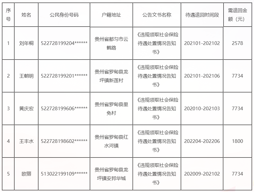 關于劉年桐等5人退回多享受社會保險待遇告知書的批量送達公告