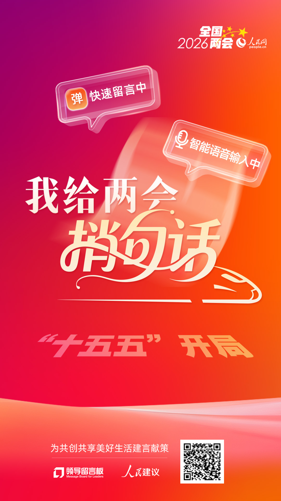 2026年是“十五五”開局之年,你對工作、生活有哪些新期盼?對國家發展有哪些期待和建議?即日起,人民網啟動2026年“我給兩會捎句話”建言征集活動,邀你說說心里話、提提好建議,一起托人大代表們捎上兩會。