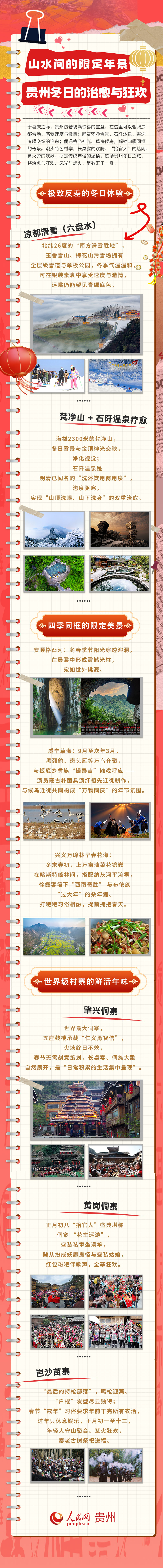 當冬日的風掠過貴州,這里便成了一幅動靜交織的年景畫卷。在北緯26度的 “南方滑雪勝地”,速度與激情在雪道上迸發;梵凈山的雪頂神光與石阡溫泉的氤氳水汽,交織出“山頂洗眼、山下洗身”的雙重治愈。格凸河的晨光穿透溶洞,草海的候鳥與鄉戲共鳴,萬峰林的油菜花已悄然綻放,解鎖“四季同框”的限定浪漫。而肇興、黃崗、岜沙的村寨里,長桌宴的熱氣、“抬官人”的歡騰、篝火旁的歌聲,讓傳統年俗在煙火里鮮活如初。這趟貴州冬日之旅,把治愈與狂歡、風光與煙火,盡數匯于山水之間。