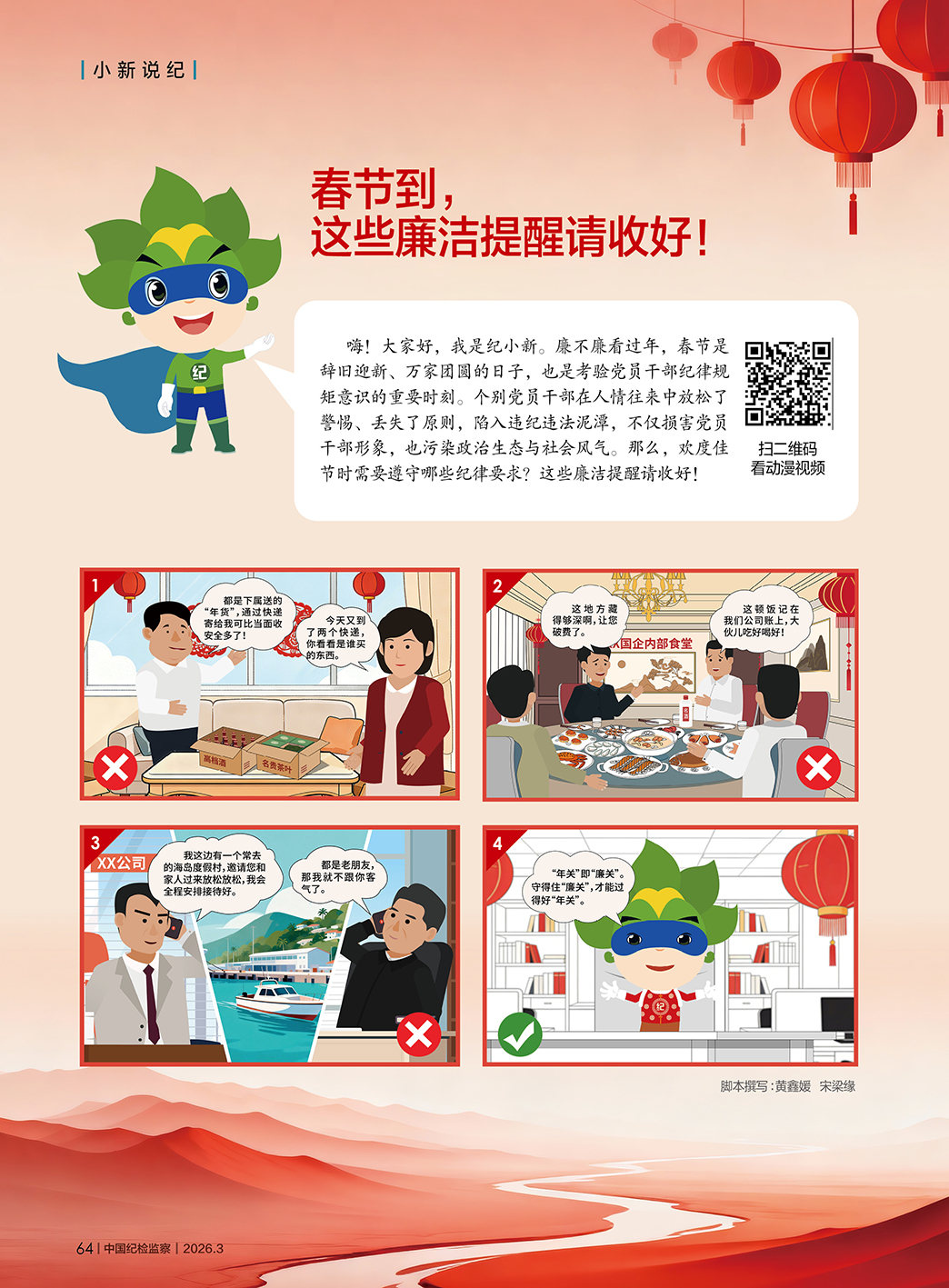 嗨!大家好,我是紀小新。廉不廉看過年,春節是辭舊迎新、萬家團圓的日子,也是考驗黨員干部紀律規矩意識的重要時刻。個別黨員干部在人情往來中放松了警惕、丟失了原則,陷入違紀違法泥潭,不僅損害黨員干部形象,也污染政治生態與社會風氣。那么,歡度佳節時需要遵守哪些紀律要求?這些廉潔提醒請收好!