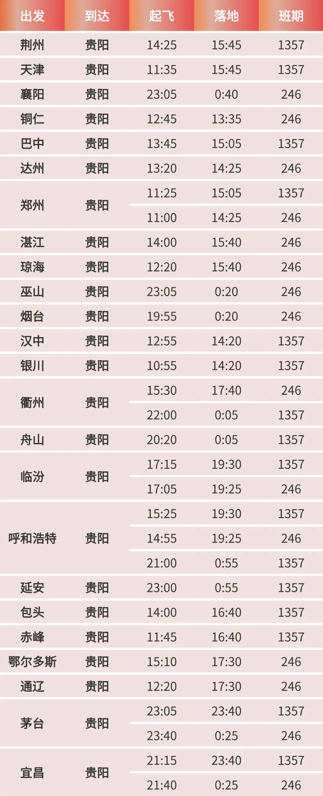 附:華夏航空2026夏秋新航季貴陽進出港航線時刻表